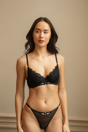 De Night Set is een zwarte set gemaakt van een zachte, kanten stof. Deze set biedt comfort en ondersteuning zonder dat de beugel irriteert op de huid, perfect voor dagelijks gebruik of speciale gelegenheden.